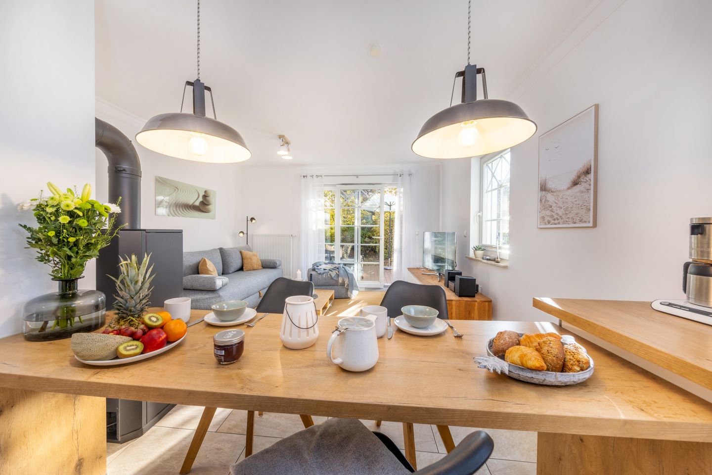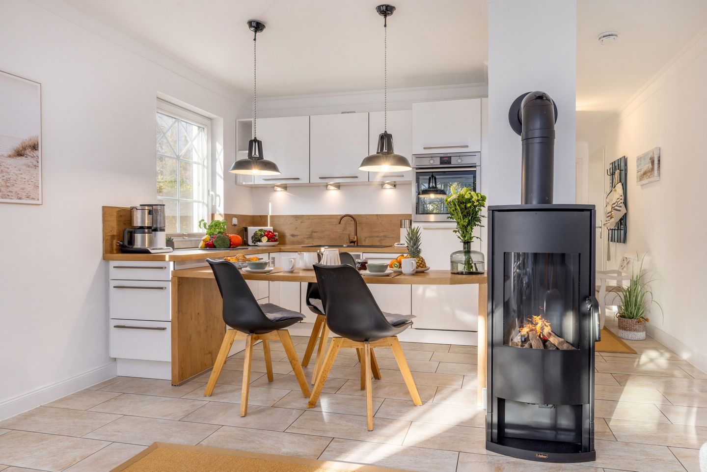 Der offene Küchenbereich ist umfassend ausgestattet und lässt keine Wünsche offen: Induktionsherd, Backofen, Kühlschrank mit Gefrierfach, Spülmaschine, Kaffeemaschine, Wasserkocher, Toaster, Eierkocher, Mixer sowie alle grundlegenden Küchenutensilien, Geschirr und Besteck stehen zur Verfügung. Der angrenzende Essplatz lädt zu gemeinsamen Mahlzeiten ein.