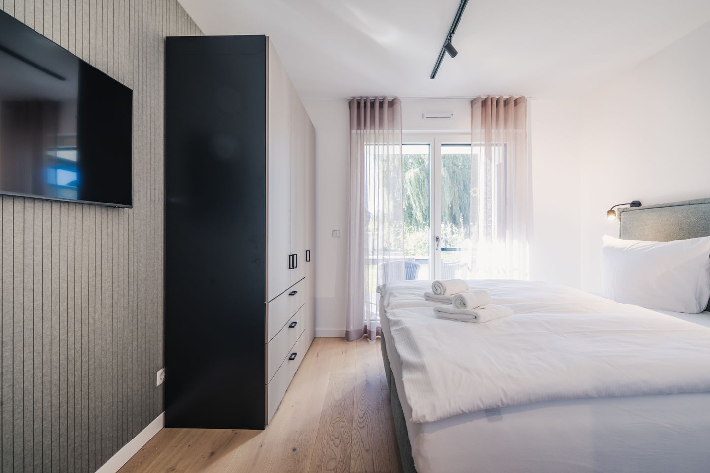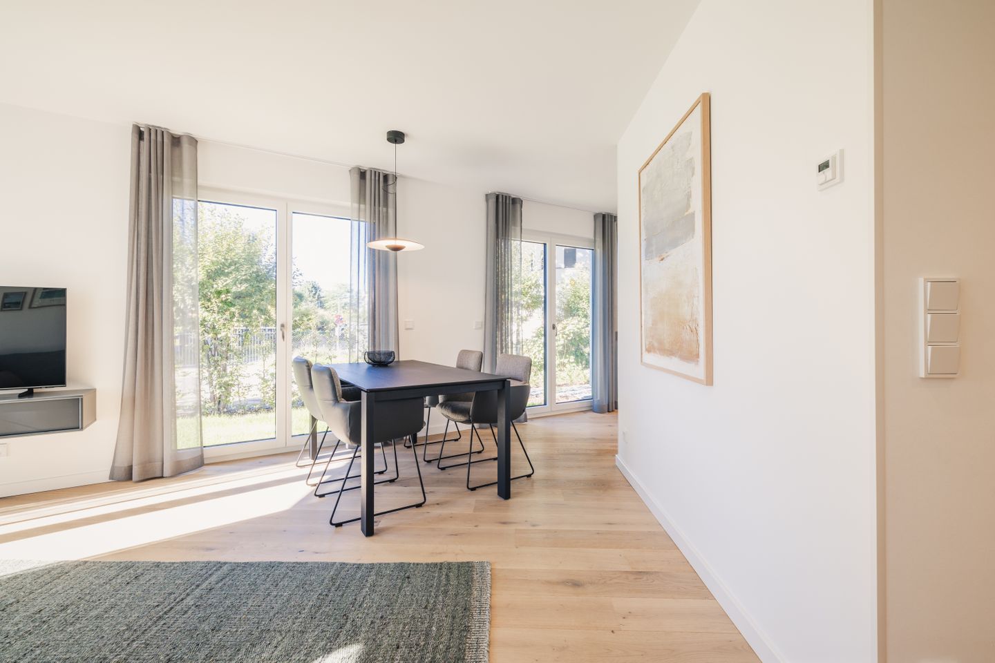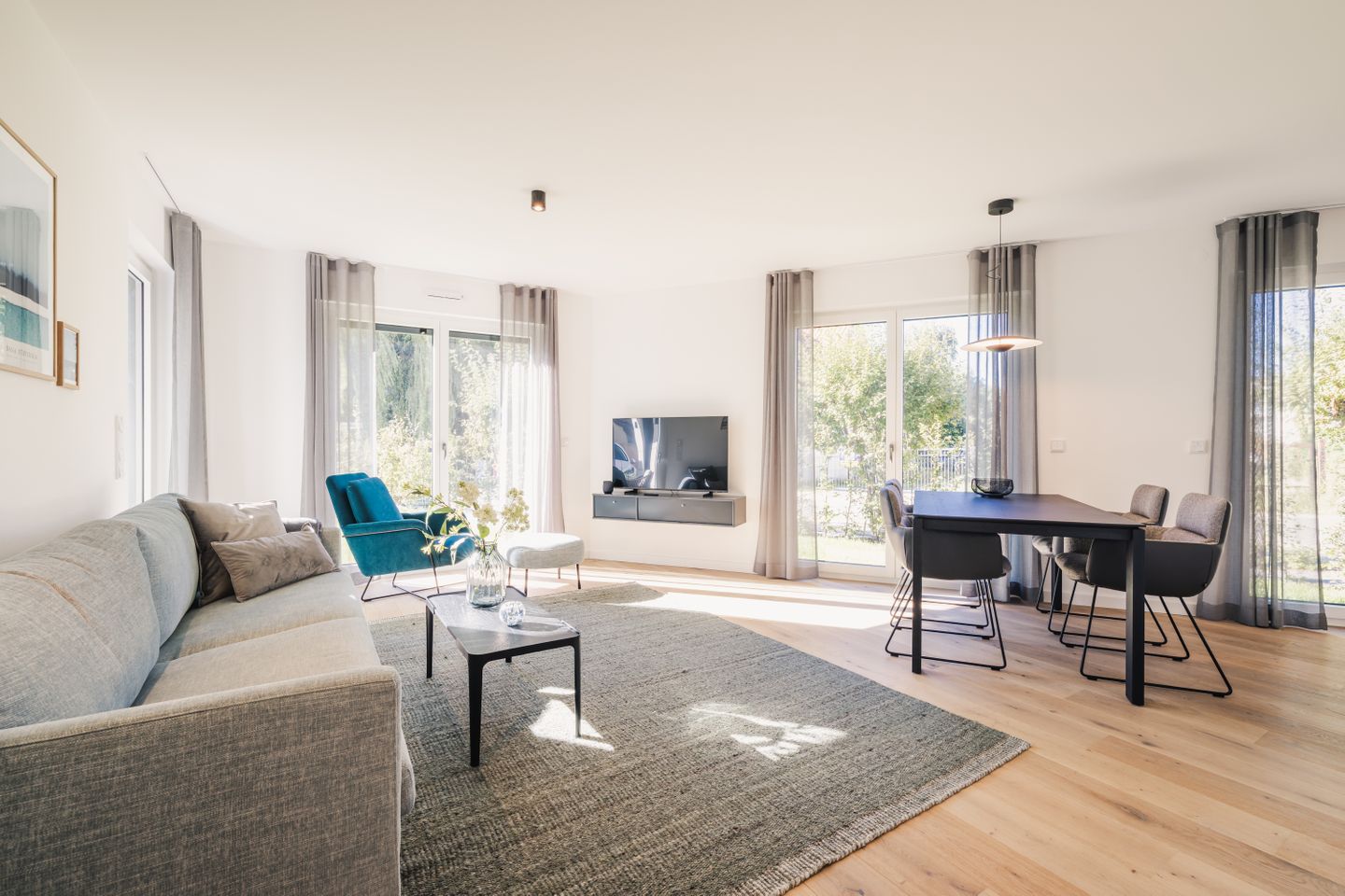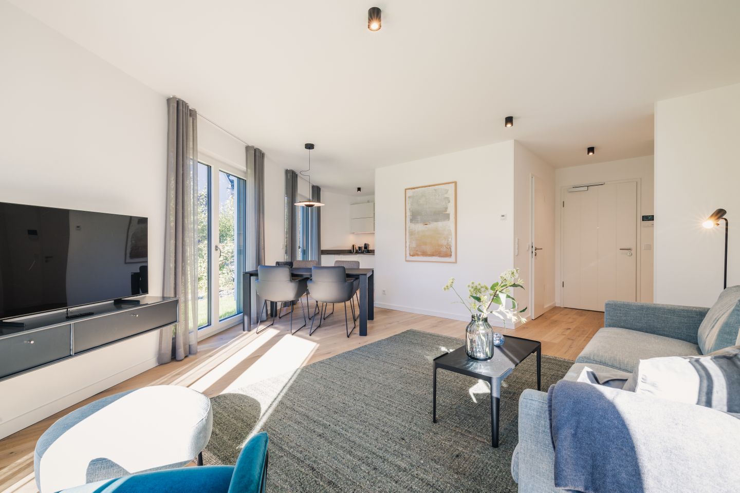 Die 3 Zimmer sind durchdacht gestaltet und verbinden modernen Komfort mit einer hochwertigen Ausstattung. Ihnen stehen 1 Schlafzimmer, ein Wohnbereich mit Sofaecke, Sofa und Sessel, ein separates Esszimmer beziehungsweise Essbereich sowie 2 Badezimmer zur Verfügung. Die offene Küche ist zum Wohnzimmer hin gestaltet und mit Induktionsherd, Backofen, Mikrowelle, Spülmaschine, Kühlschrank mit Gefrierfach, Wasserkocher, Toaster, Kaffeemaschine, Nespresso-Maschine sowie Küchenutensilien, Geschirr und Besteck vollständig ausgestattet. Drei TVs mit Kabelanschluss sowie WLAN und Internet sorgen auch im Innenbereich für einen angenehmen Aufenthalt.