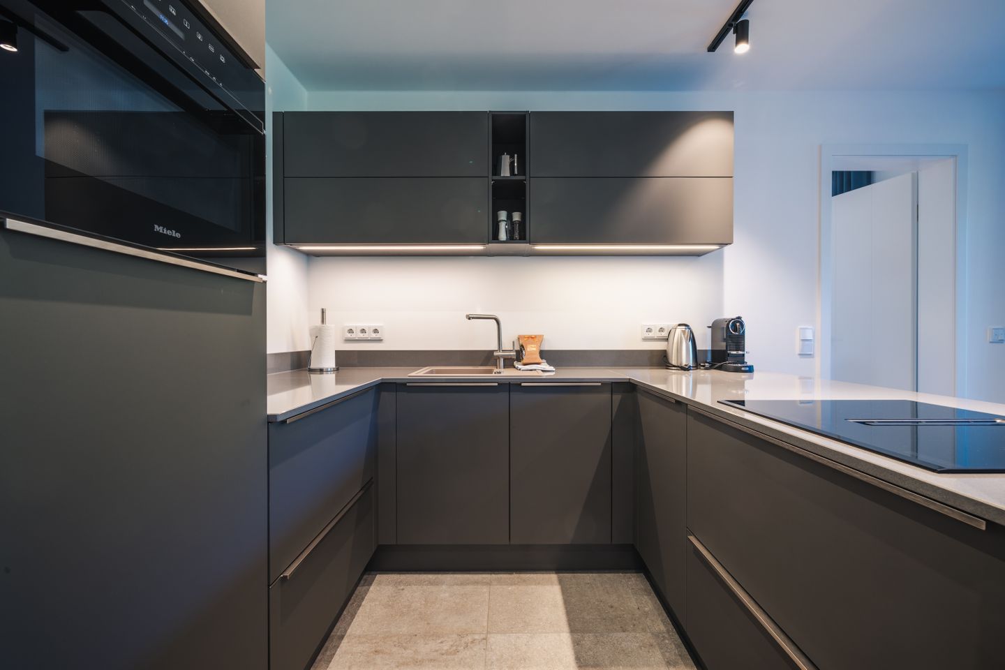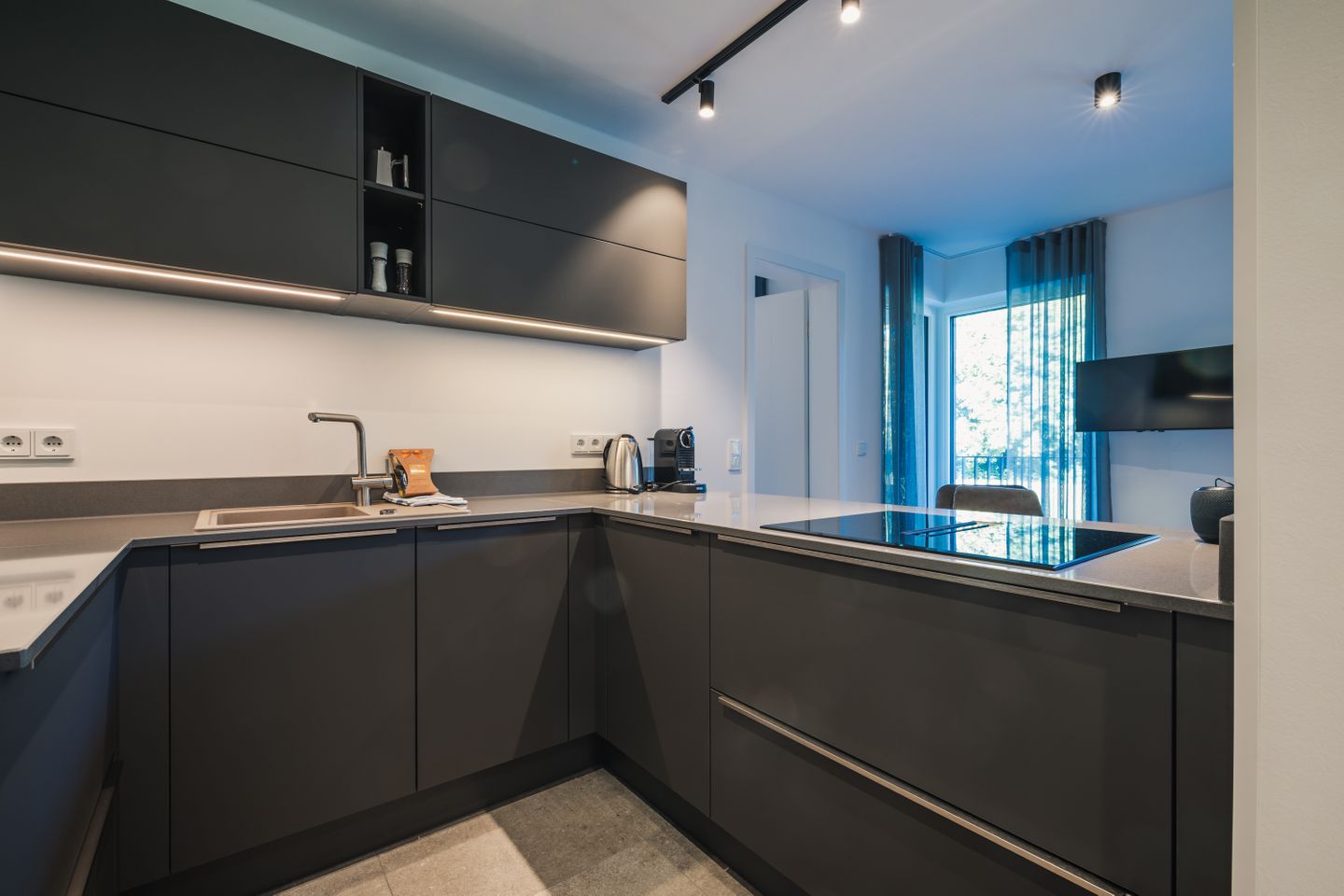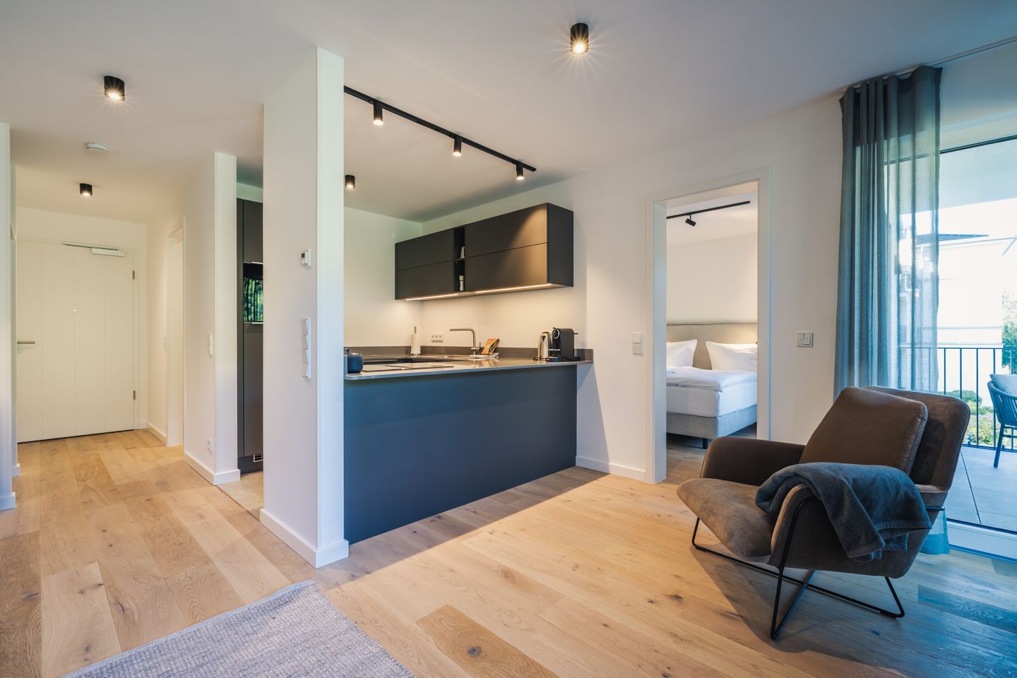 Die offen zum Wohnzimmer gestaltete Küche ist funktional und umfassend ausgestattet. Sie verfügt über einen Induktionsherd, Backofen, Mikrowelle, Spülmaschine, Kühlschrank mit Gefrierfach, Wasserkocher, Toaster, Kaffeemaschine sowie eine Nespresso-Espressomaschine. Geschirr, Besteck und Küchenutensilien stehen Ihnen ebenfalls zur Verfügung. Das moderne Badezimmer ist mit einer bodengleichen Dusche, WC, Waschbecken, Spiegel, Kosmetikspiegel und Haartrockner ausgestattet.