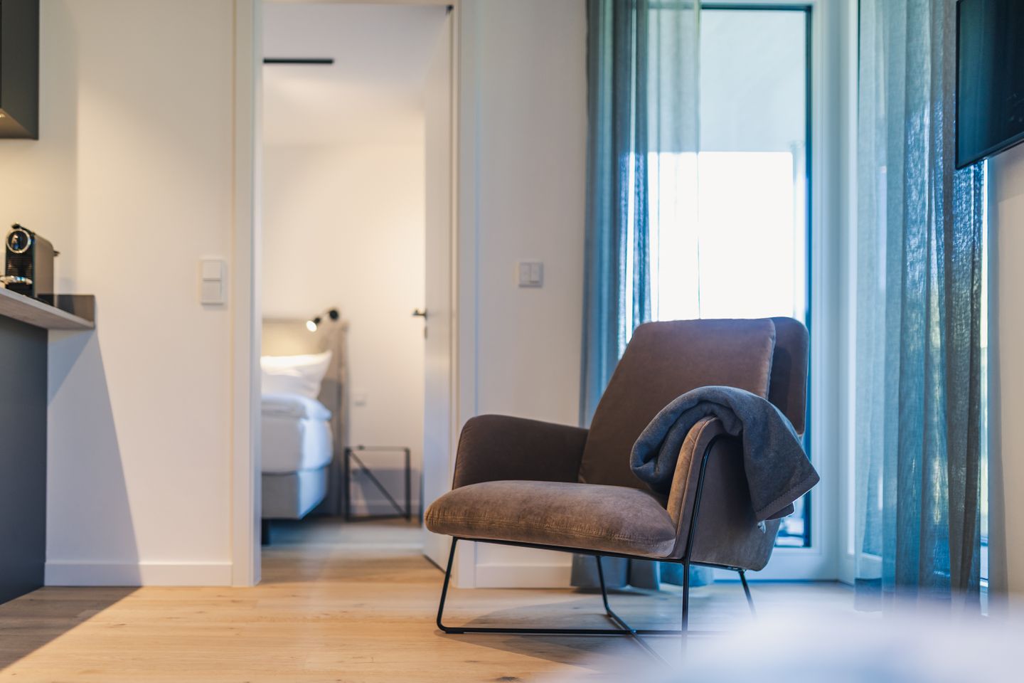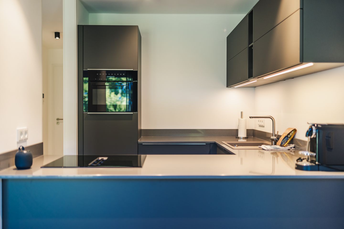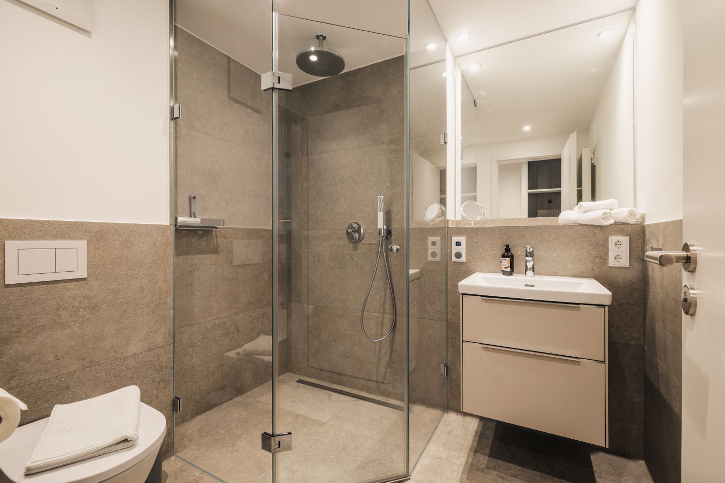 Die offen zum Wohnzimmer gestaltete Küche ist funktional und umfassend ausgestattet. Sie verfügt über einen Induktionsherd, Backofen, Mikrowelle, Spülmaschine, Kühlschrank mit Gefrierfach, Wasserkocher, Toaster, Kaffeemaschine sowie eine Nespresso-Espressomaschine. Geschirr, Besteck und Küchenutensilien stehen Ihnen ebenfalls zur Verfügung. Das moderne Badezimmer ist mit einer bodengleichen Dusche, WC, Waschbecken, Spiegel, Kosmetikspiegel und Haartrockner ausgestattet.