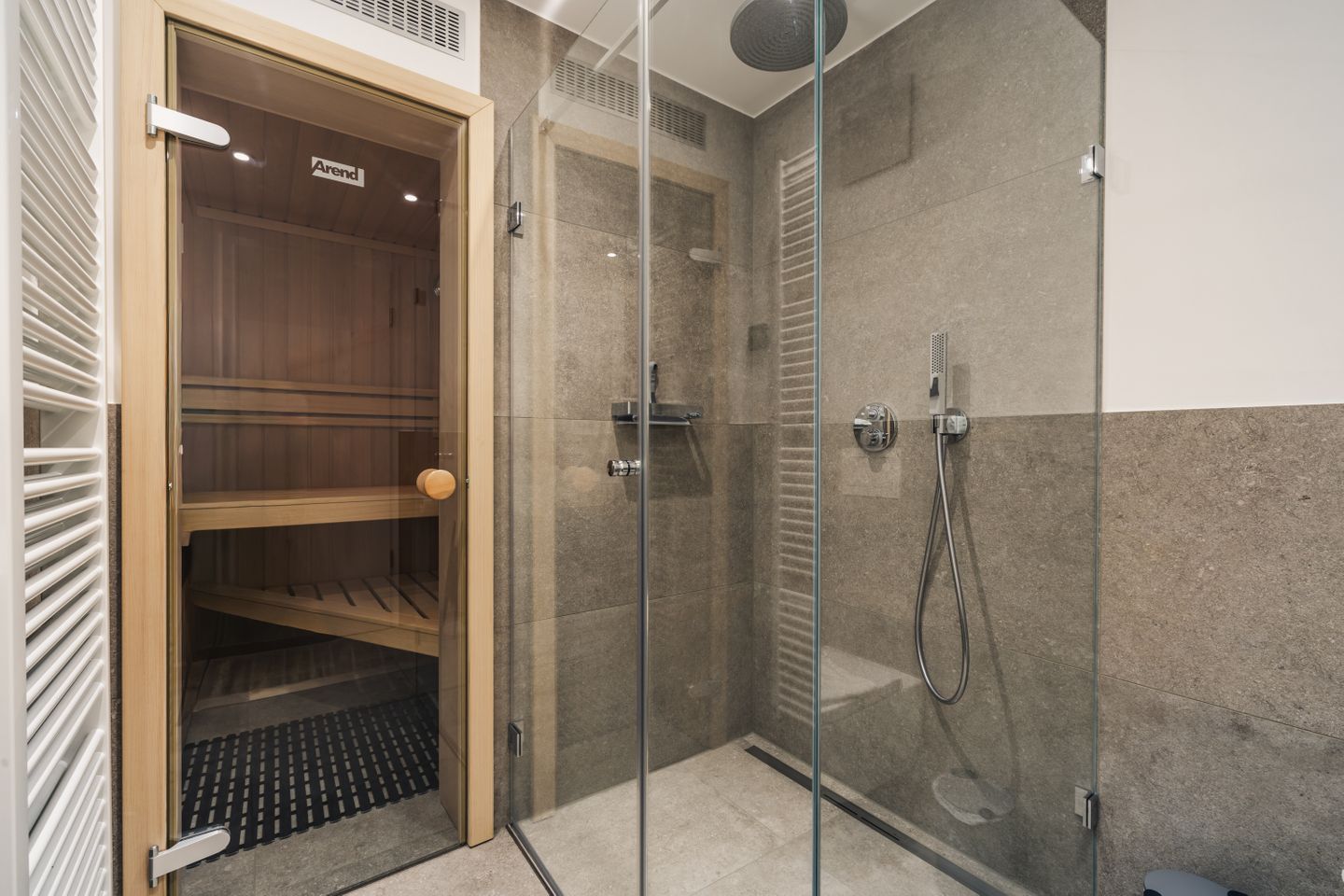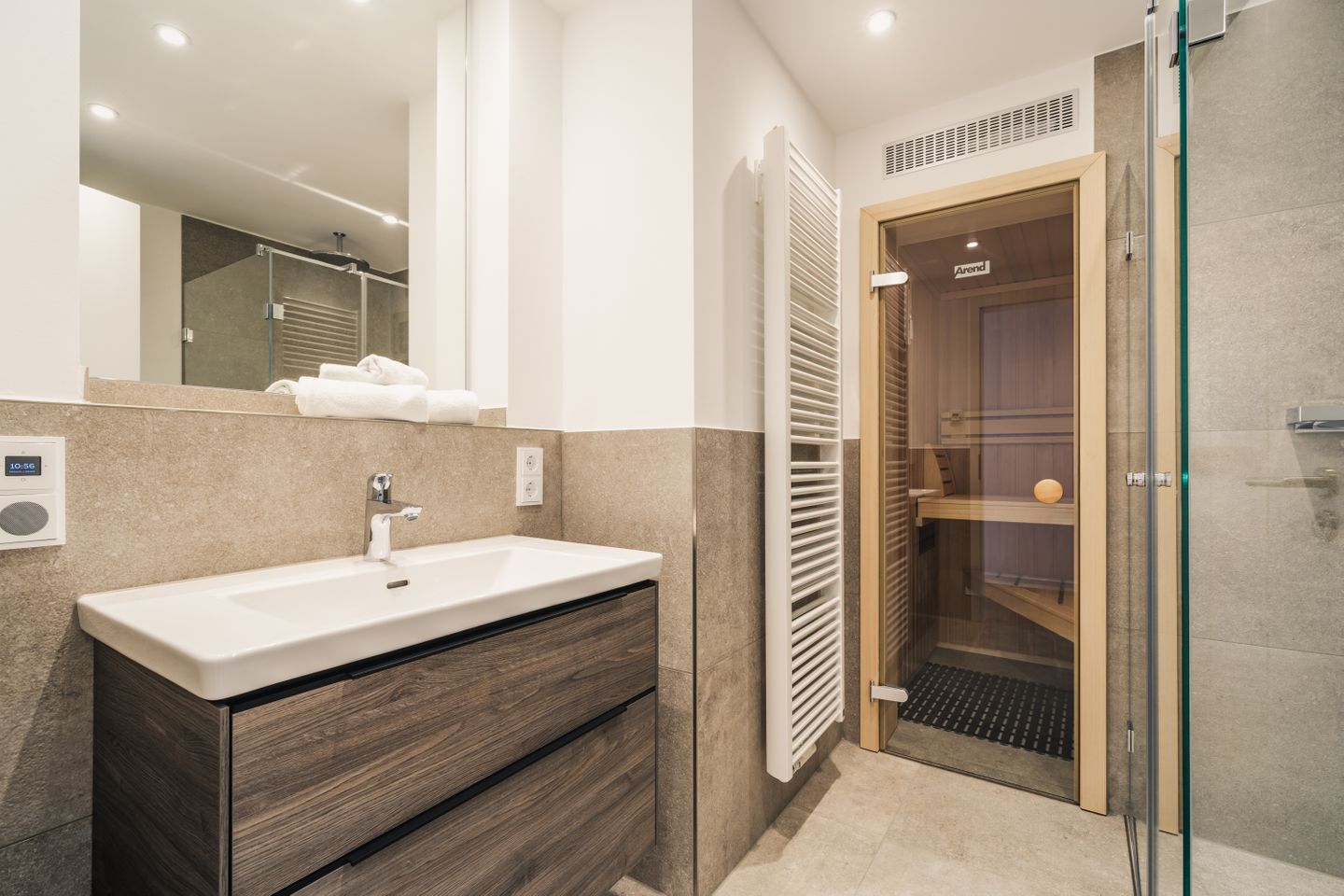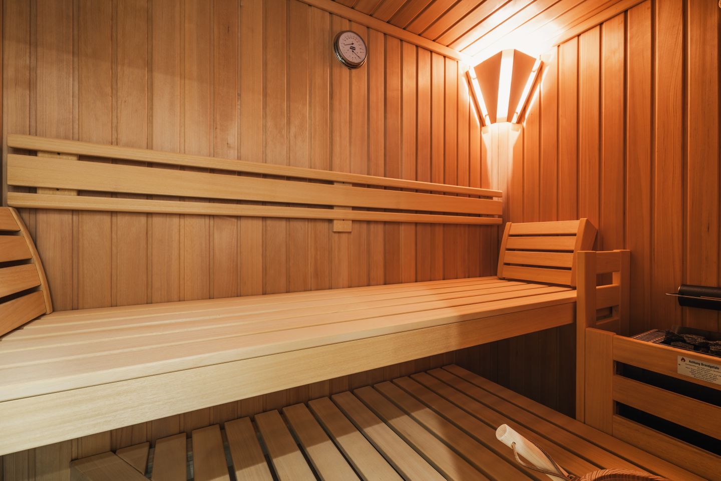 Das Badezimmer bietet eine bodengleiche Dusche, Waschbecken, WC, Spiegel, Kosmetikspiegel und Haartrockner. Ein besonderes Ausstattungsmerkmal ist die Sauna zur Eigennutzung, die Ihnen zusätzlichen Komfort verschafft. Waschmaschine und Trockner stehen Ihnen ebenfalls zur Eigennutzung zur Verfügung. Bügeleisen, Bügelbrett, Staubsauger, Garderobe, Abfalleimer, Verbandskasten und Feuerlöscher ergänzen die praktische Ausstattung.