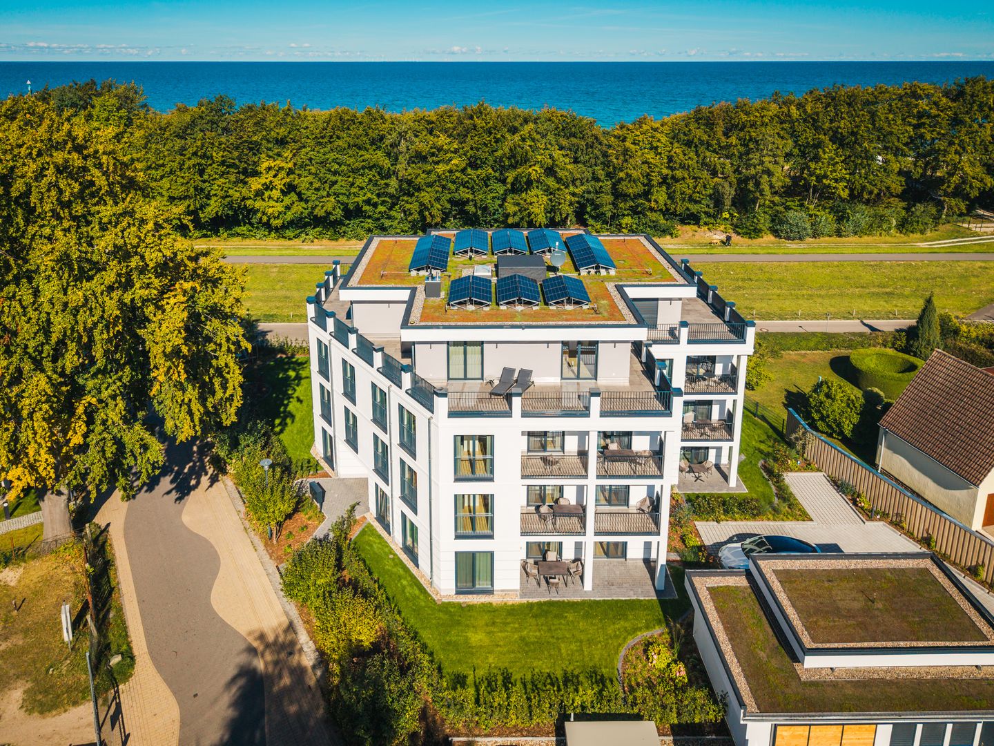 Die Ferienwohnung Strandvilla Zingst- AP 09 befindet sich im 1. Stock eines 2025 erbauten Hauses in hervorragender Lage in Zingst. Nur etwa 100 Meter vom Sandstrand und vom Meer entfernt, in erster Reihe am Strand, bietet diese Unterkunft ideale Voraussetzungen für einen erholsamen Aufenthalt an der Ostsee. Restaurants erreichen Sie bereits nach rund 200 Metern, Einkaufsmöglichkeiten nach etwa 750 Metern. Auch ein Arzt, eine Bank oder ein Geldautomat sowie ein Supermarkt befinden sich in der Nähe. Für Golffreunde liegt eine Golfmöglichkeit nur etwa 700 Meter entfernt.