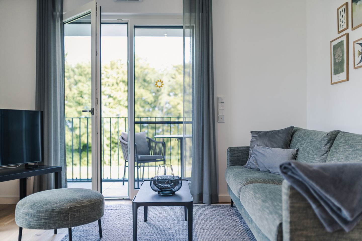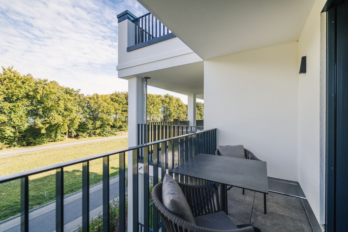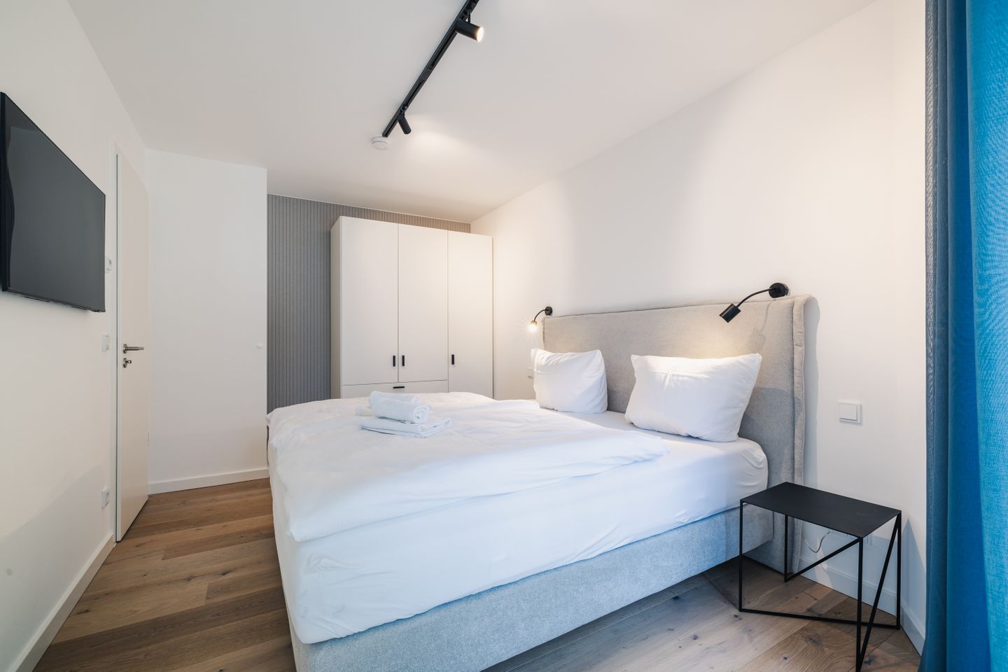 Zum Apartment gehören ein überdachter Balkon mit Gartenmöbeln, ein Privatparkplatz sowie eine Garage. Ein Aufzug im Haus erleichtert den Zugang zur Wohnung. Zusätzlich stehen eine E-Bike-Ladestation und eine Elektroauto-Ladestation zur Verfügung. Für Sicherheit sorgen Feuermelder, Feuerlöscher und Verbandskasten.