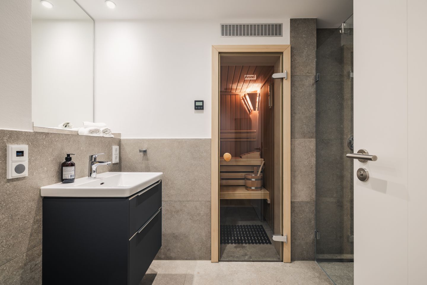 Das Badezimmer verfügt über eine bodengleiche Dusche, WC, Waschbecken, Spiegel, Kosmetikspiegel und Haartrockner. Besonders angenehm ist die Sauna zur Eigennutzung, die Ihnen private Wellnessmomente direkt in der Unterkunft ermöglicht. Waschmaschine und Trockner stehen zur Eigennutzung bereit; außerdem sind Bügeleisen, Bügelbrett und Staubsauger vorhanden.