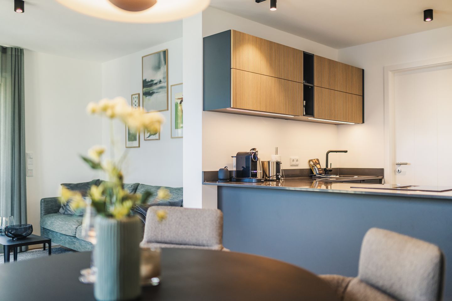 Der Wohnbereich ist mit Sofa, Sofaecke, Sessel, Kommode und Esstisch komfortabel eingerichtet. Zwei TVs mit Kabelanschluss bieten zusätzliche Unterhaltung. Fliegengitter und Garderobe ergänzen die praktische Ausstattung. Die offene Küche ist funktional und hochwertig ausgestattet: Induktionsherd, Backofen, Mikrowelle, Spülmaschine, Kühlschrank mit Gefrierfach, Wasserkocher, Toaster, Kaffeemaschine, Nespresso-Espressomaschine sowie Küchenutensilien, Geschirr und Besteck sind vorhanden.